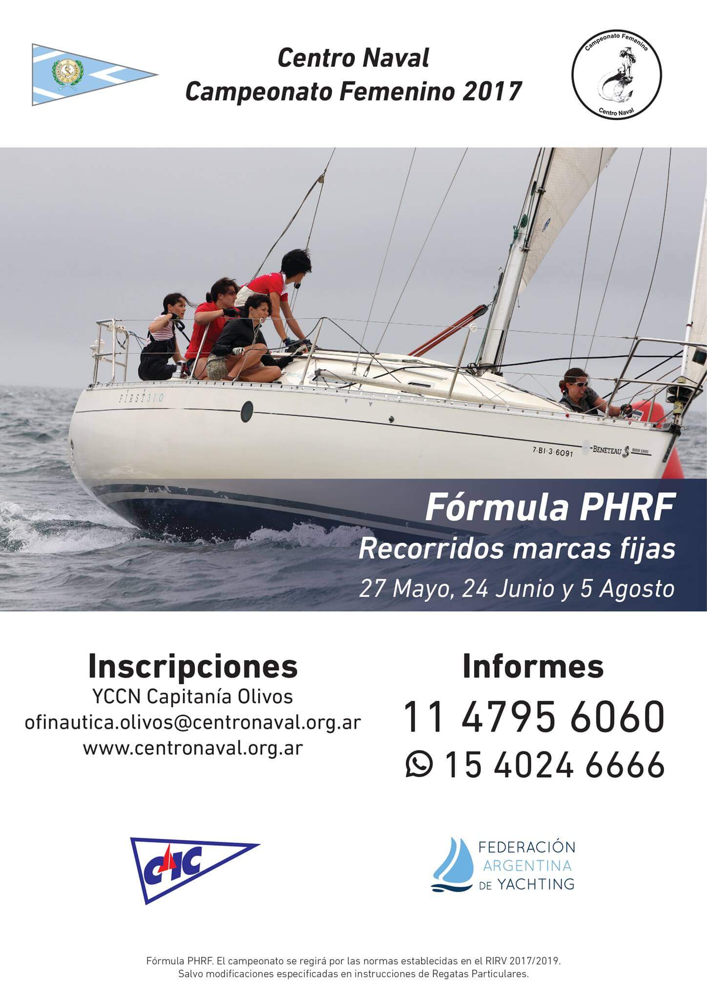 Los sábados 27 de mayo, 24 de junio y 5 de agosto son las fechas elegidas para el primer Campeonato Femenino de Vela organizado por el Yacht Club Centro Naval, para PHRF y bajo el formato marcas fijas.